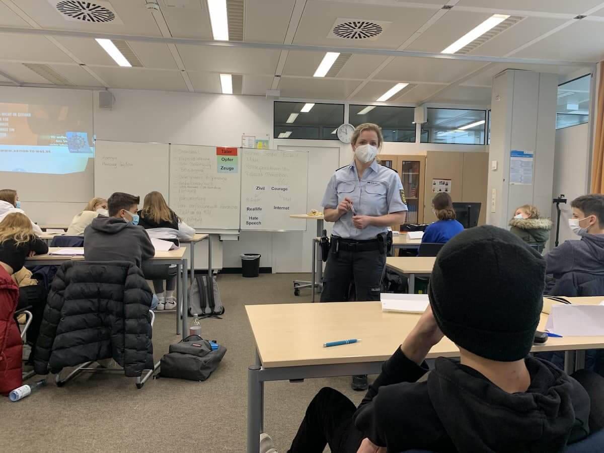 Mit „Stehst du auch nur daneben und schaust zu?“ ging es in den drei Folgestunden mit Frau Fröhner-Bender und ihrem Team um die Frage der Zivilcourage im realen Leben und im Internet (Hatespeech). Mit der Zeit wurde allen klar, dass der Unterschied zwischen diesen Bereichen nicht gezogen werden muss. Hemmungen, Hemmungslosigkeit, Verantwortungslosigkeit und die Möglichkeit, im Internet richtig zu handeln, entspricht denen des realen Lebens.