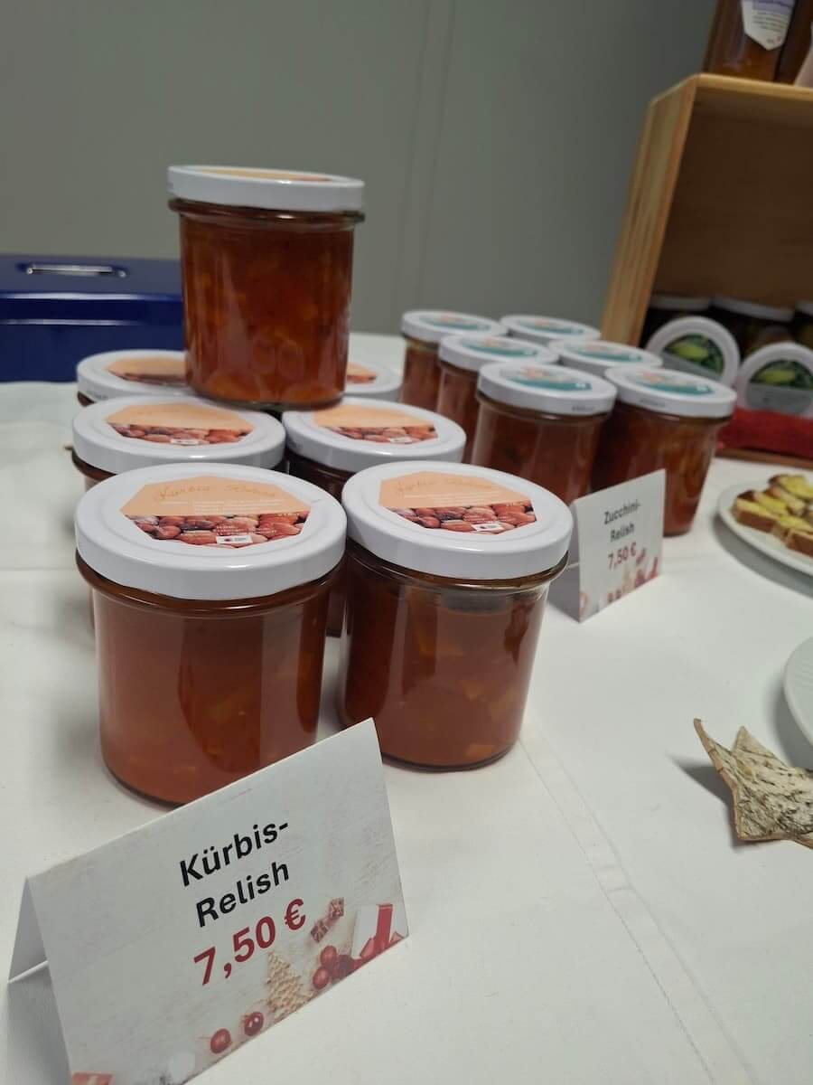 An zwei Tagen bot die Klasse ihre Erzeugnisse dem Lehrerkollegium an. Zu den angebotenen Produkten gehörten süße Fruchtaufstriche, herzhafte Relishe, eingelegte Zucchini, Pflaumensoße, Butterbrotsalz und Weihnachtsplätzchen. Die Resonanz war positiv, und viele der vorbereiteten Artikel fanden schnell Abnehmer.