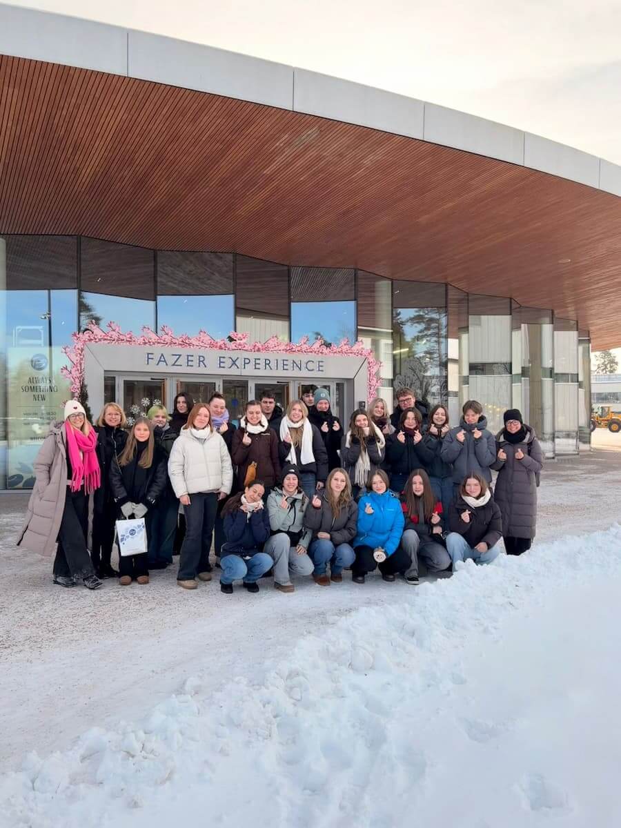 Passend zum Profil des ernährungswissenschaftlichen Gymnasiums besuchte die Klasse den Lebensmittelkonzern Fazer, der für seine breite Produktpalette von Süßwaren, Backwaren und Haferprodukten bekannt ist. Die Schülerinnen und Schüler erhielten Einblicke in die Schokoladenproduktion und die Getreideverarbeitung. Außerdem setzten sie sich mit ihrer eigenen Ernährung auseinander, indem sie virtuell eine ausgewogene Mahlzeit zusammenstellten. Ein weiteres Highlight war das gemeinsame Backen von Pullas – den in Finnland sehr beliebten Zimtschnecken.
