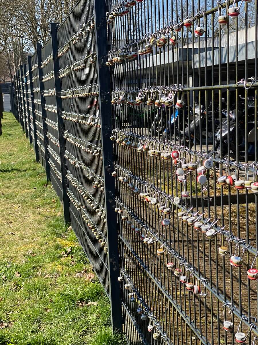 Eine ungewöhnliche Entdeckung machten die Sammelnden am Zaun des Parkplatzes des Berufsschulzentrums: Dort waren zahlreiche Bügelflaschenverschlüsse befestigt. Kurz stellte sich die Frage: „Ist das Kunst – oder kann das weg?“